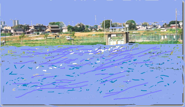 今日は下流の花見川が満杯の為大和田機場は放水を手加減している模様で流れが緩かった |